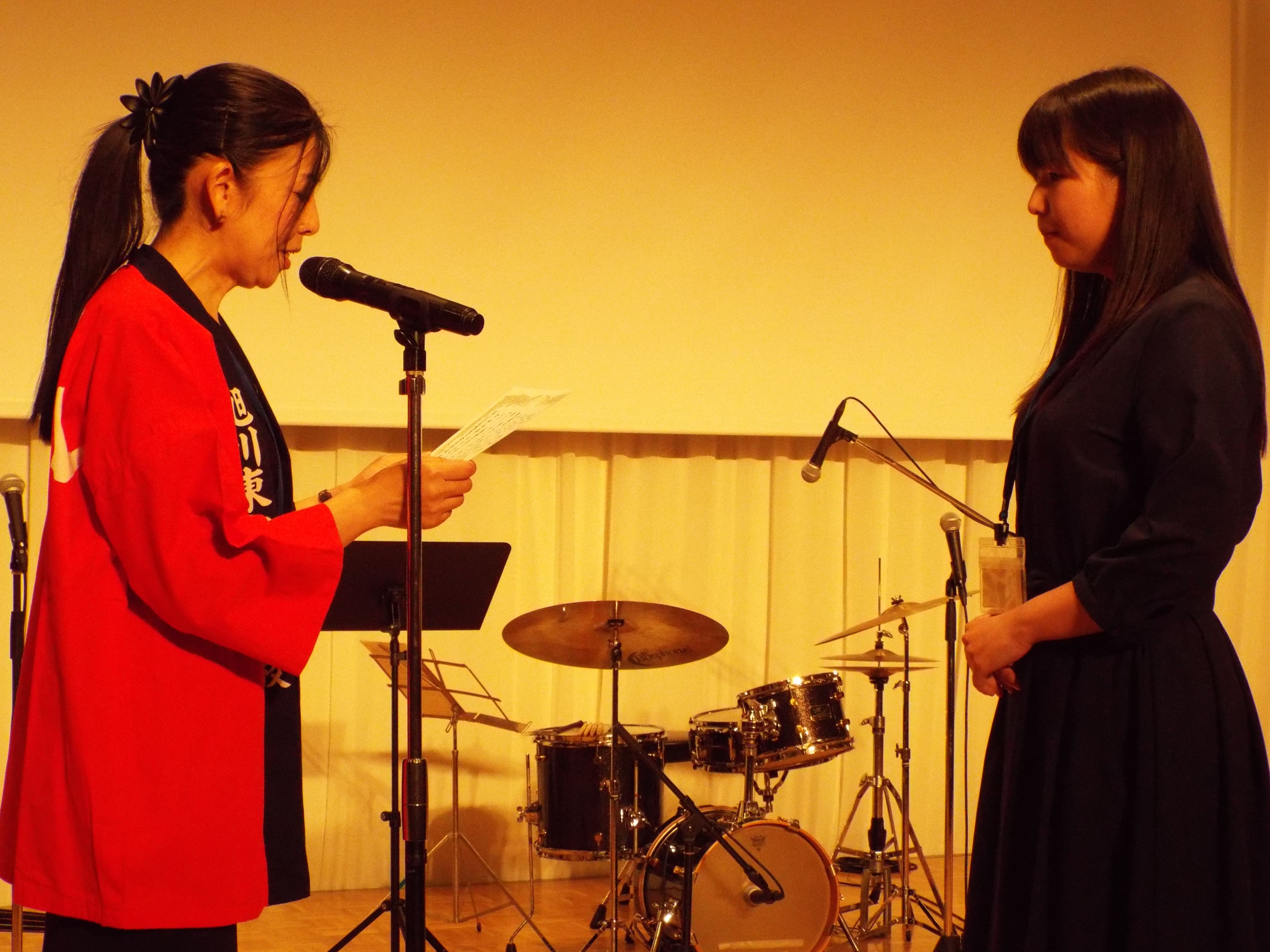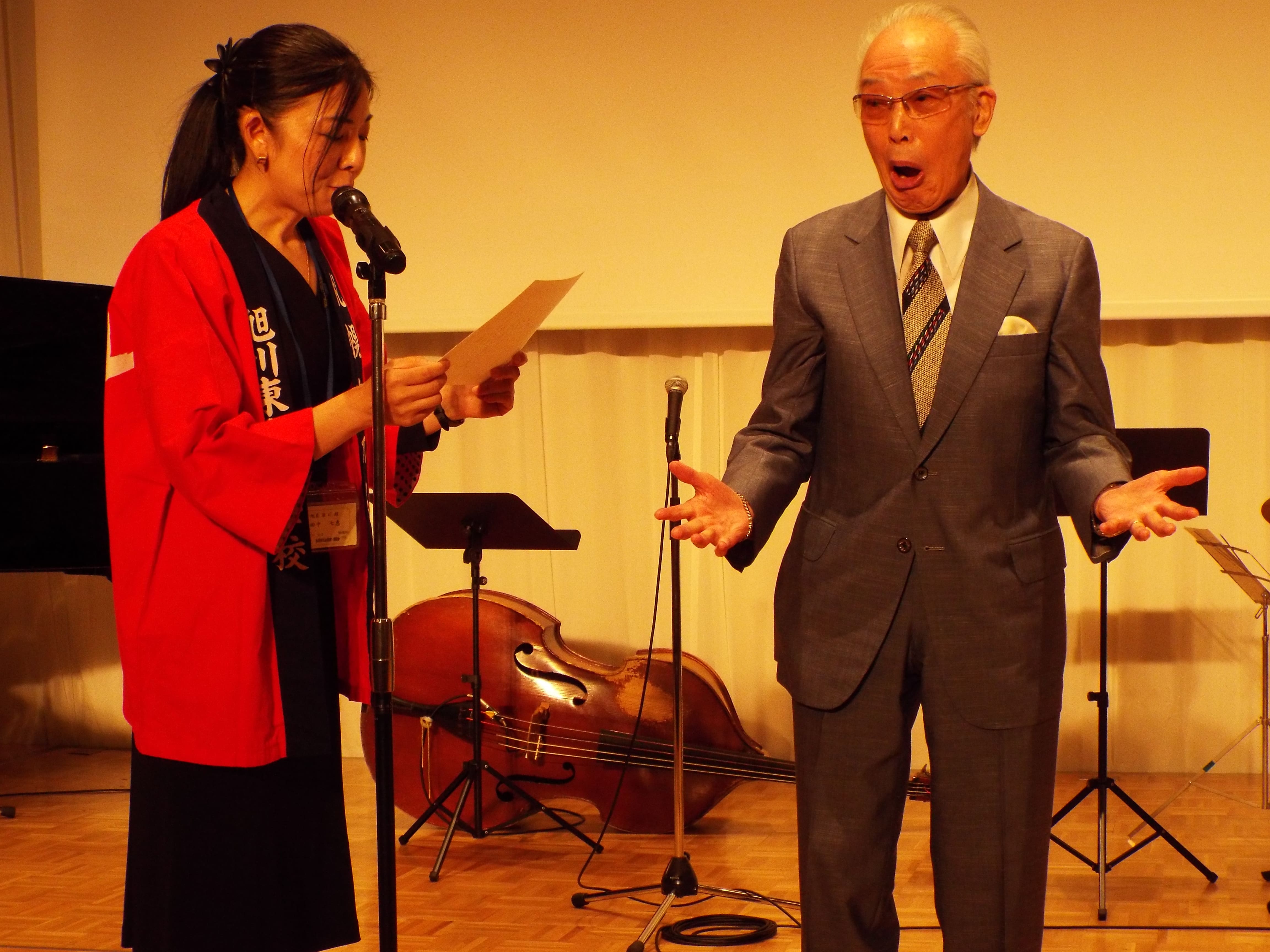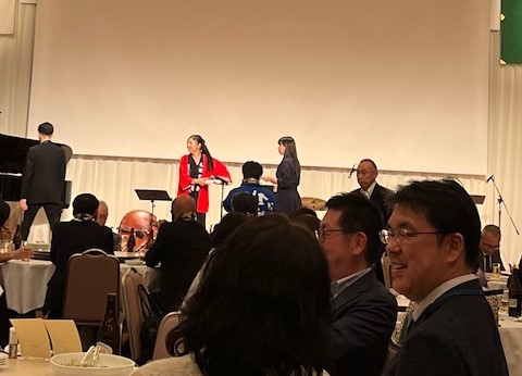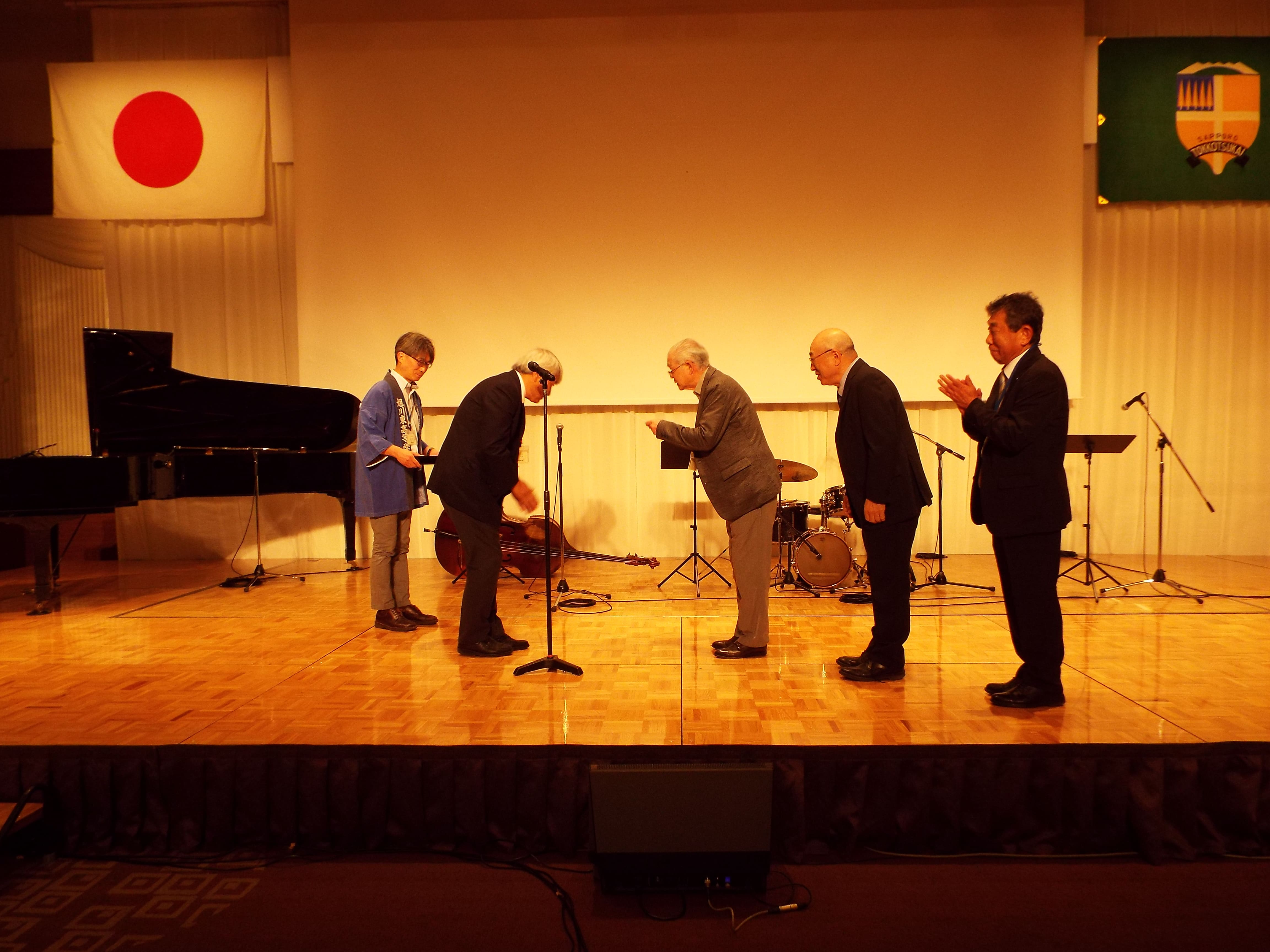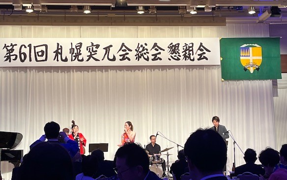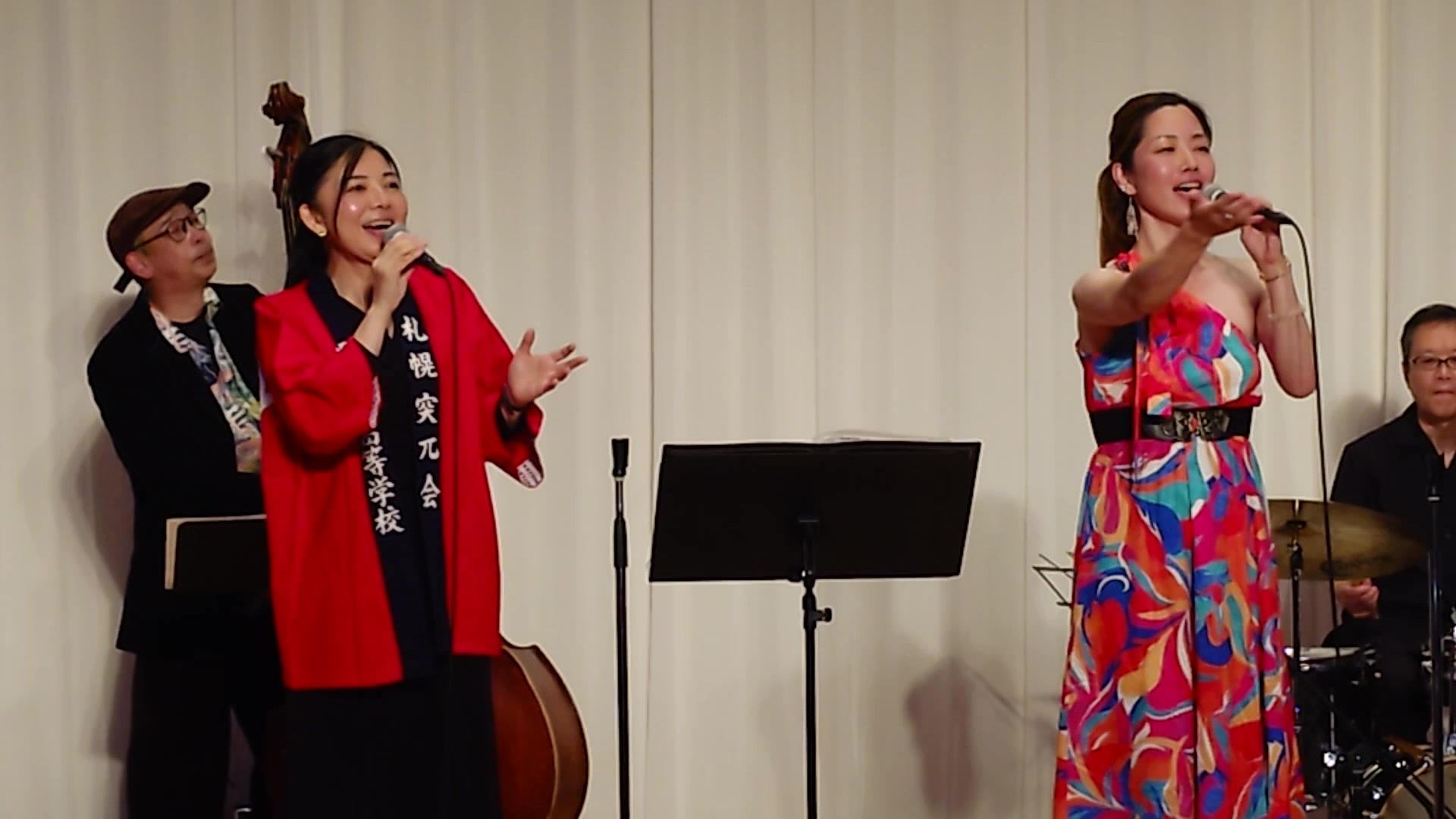 そしていよいよ今回のメインイベント、「余興Jazz」がはじまった。当番長がJazzシンガーなのでと企画された今回の余興は、余興と呼ぶにはあまりにも圧巻だった。プロのミュージシャン(ピアノ南山 ドラム館山 ベース豊田 サックス村川)をバックに、東京で活躍している51期の門馬瑠依さんによる「Someday my prince will come」の後、当番長41期の田中七恵さんによる「Caravan」と続き、最後に「What a wonderful world」を歌ったときはスタンディングオベーション、そしてアンコールが会場に響き渡った。1万円のディナーショーでもおかしくないすばらしい内容だった。