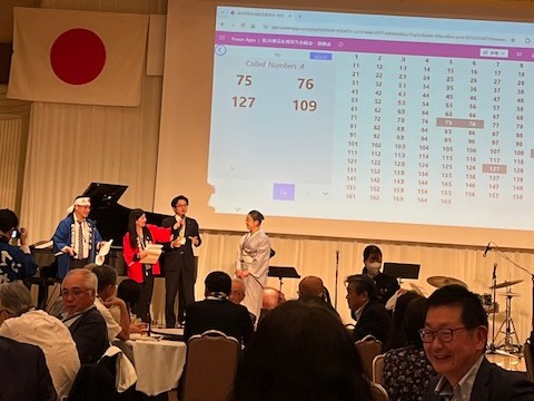 懇親会も終盤となり、同窓会からの年会費納入のお願い、最年長・最年少表彰の後、感動の41期への引継ぎが行われた。今回の懇親会の冒頭で「たすき」を受け次期当番に「たすき」を渡す・・・コロナ禍のいやな思い出を払拭するかのように、力強く引継ぎが行われた後、恒例の校歌・応援歌を母校合唱部の映像と一緒に歌い、幹事長の乾杯で第60回突兀会総会・懇親会は静かに幕を閉じ、それぞれの同期会へと引継がれていくのだった。