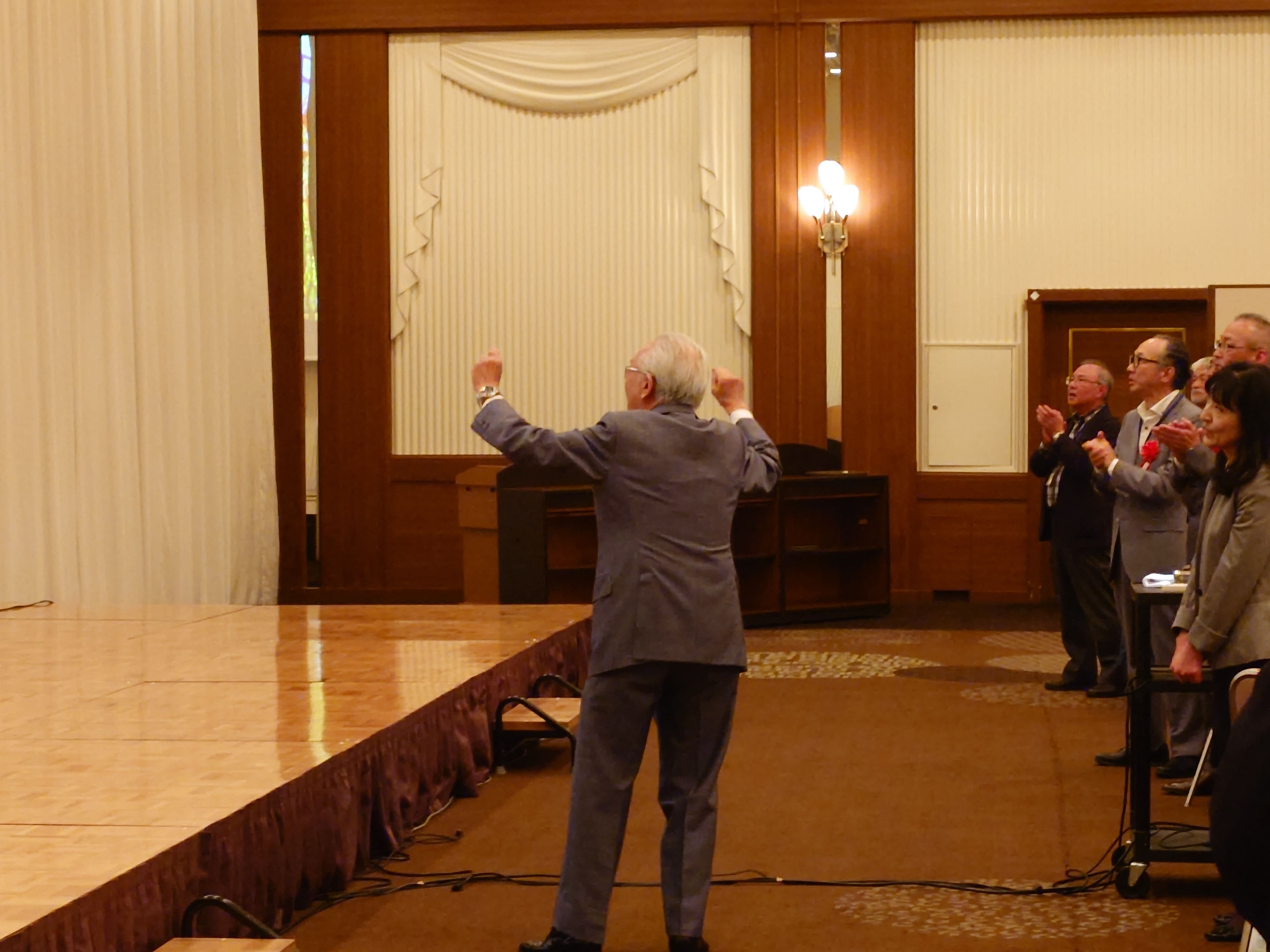 旭中43期、御歳93才。しかも矍鑠としている。突兀会の名前の由来となった旭川中学の校歌「突兀七千有余尺大雪山は巍然たり」を歌うフィナーレの時、両手を高々と上げ自信に満ちた表情で高らかにうたうその姿は神々しくもあり、まさに神降臨と呼ぶにふさわしかった。