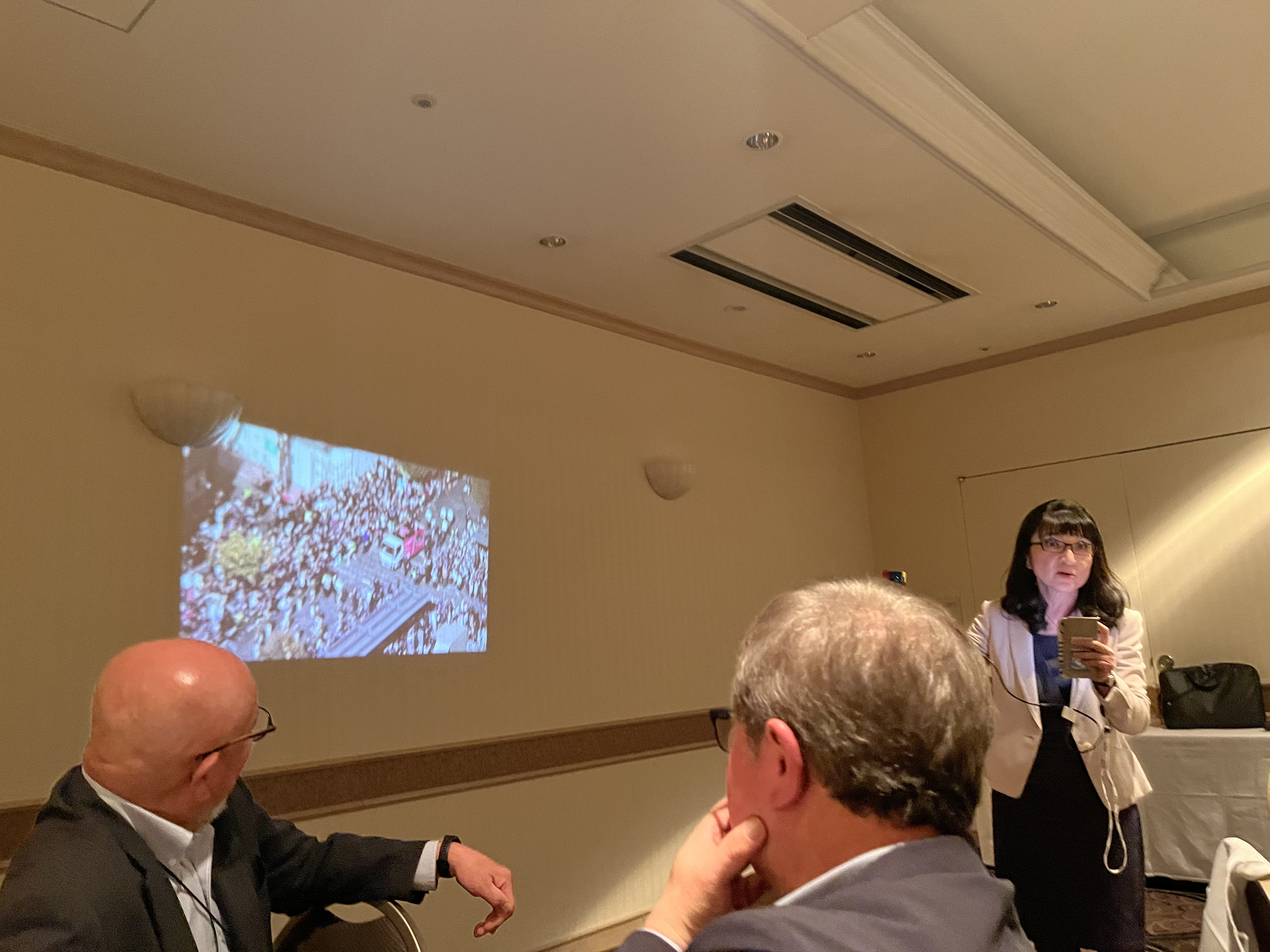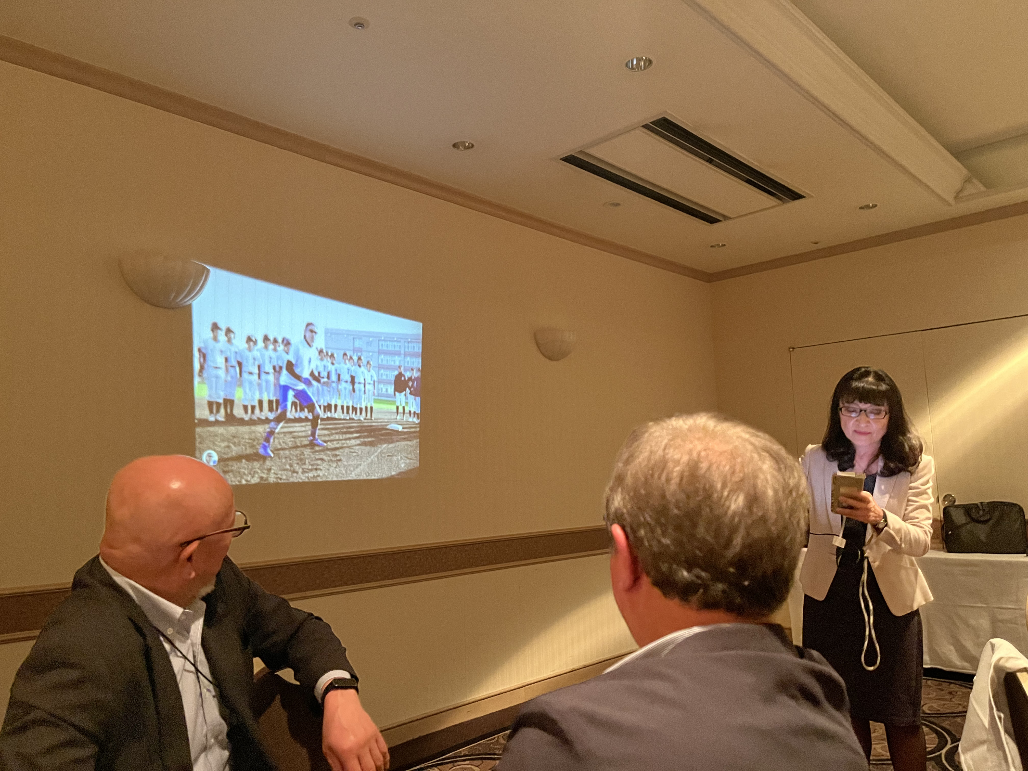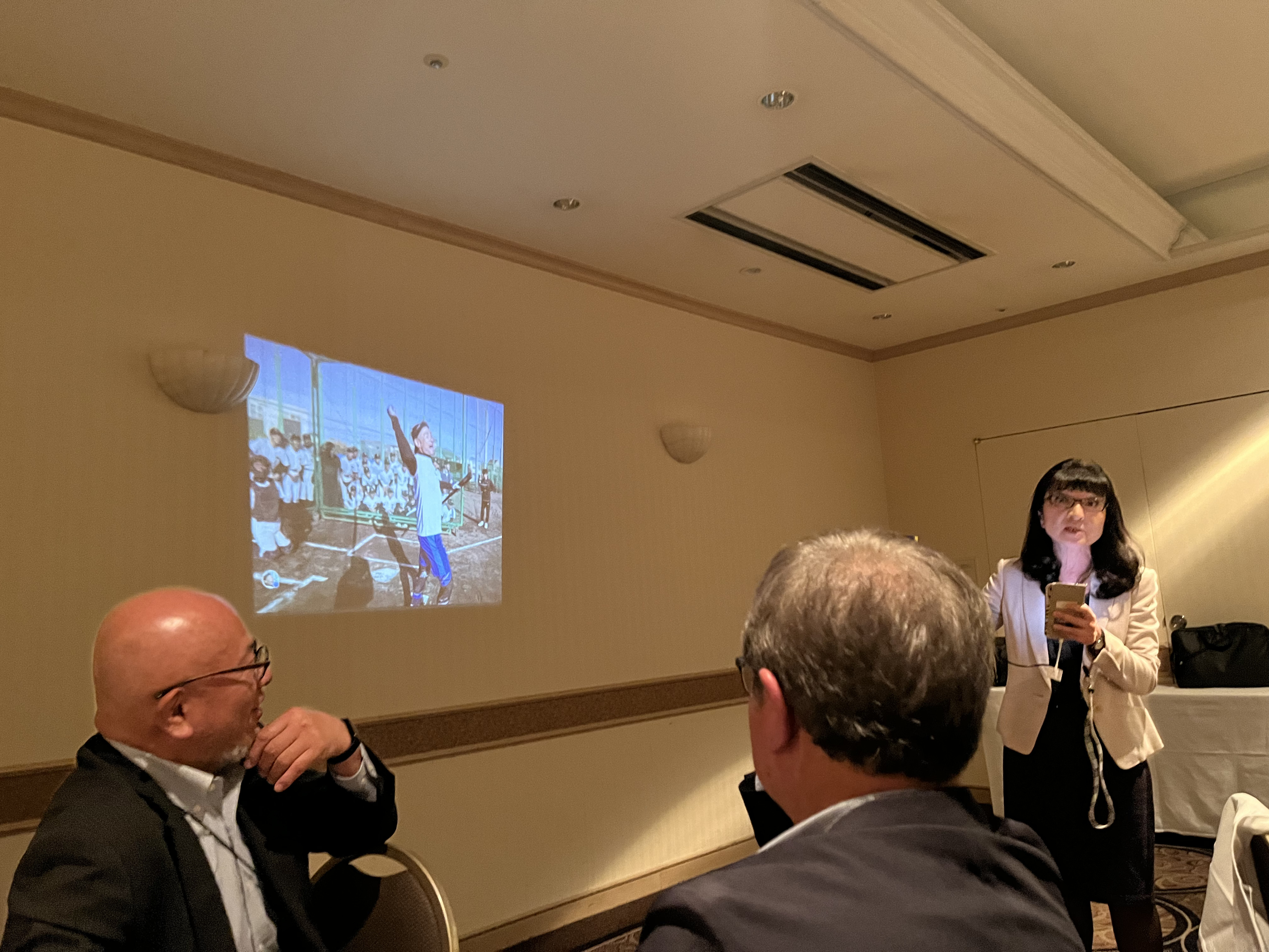 旭川東高の後輩たちの活躍を皆口々に賞賛し、北口さんのパレードの話で盛り上がってきたところで、菅原さんがメダル祝賀会の写真をスクリーンに写し更なる説明をしてくれた。